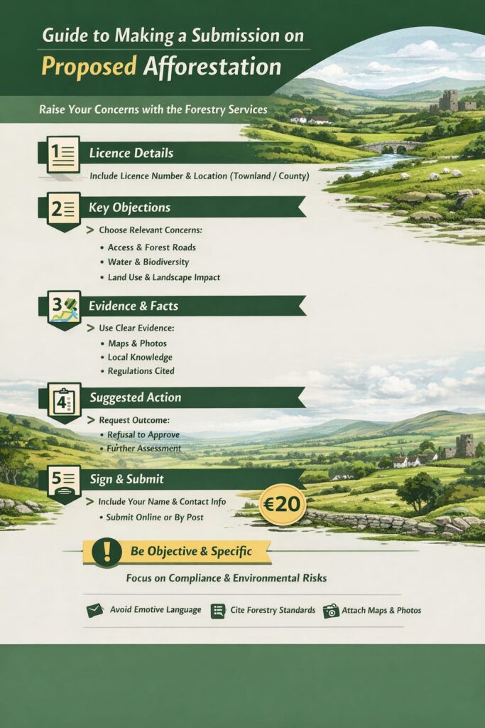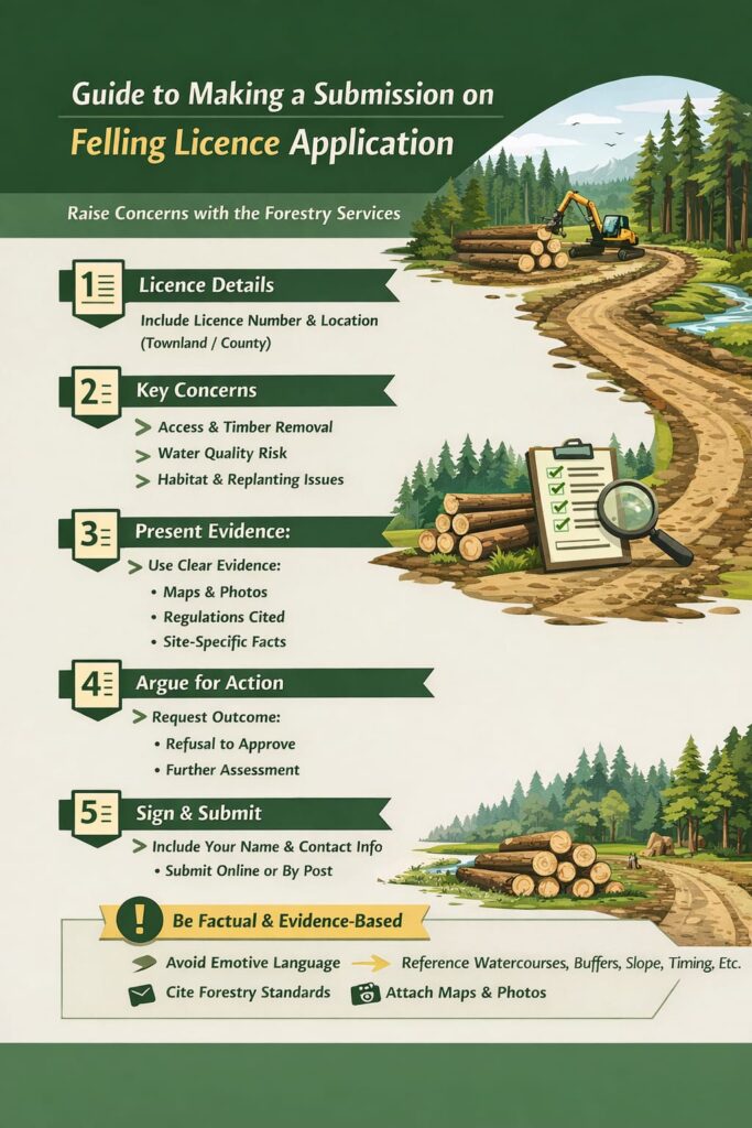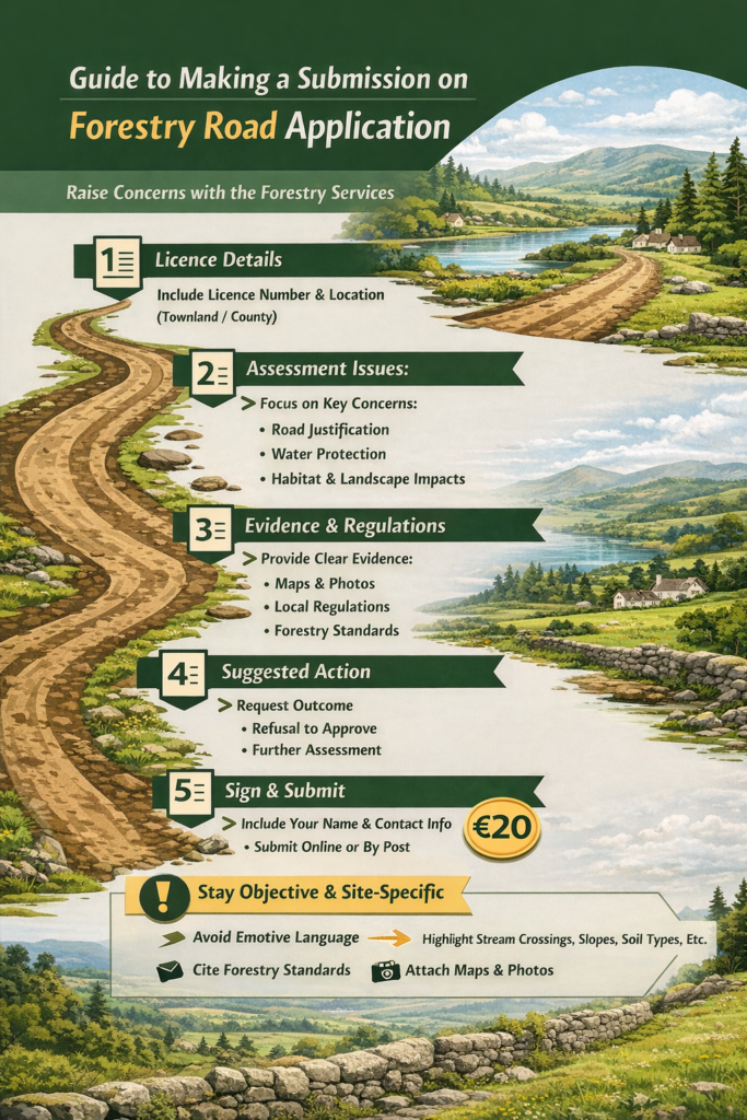 Enquiries and submissions on applications for licences for Afforestation, Forest Roads, or Aerial Fertilisation should be addressed to: